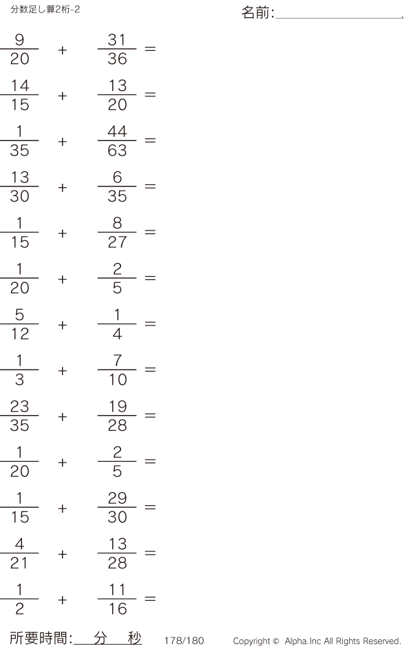 上記のボタンから「分数の足し算(分母2桁-2)」の算数数学ドリル・計算ドリル(PDFプリント)がダウンロードできます。個人利用は無料です(家庭以外での配布は有料です)。