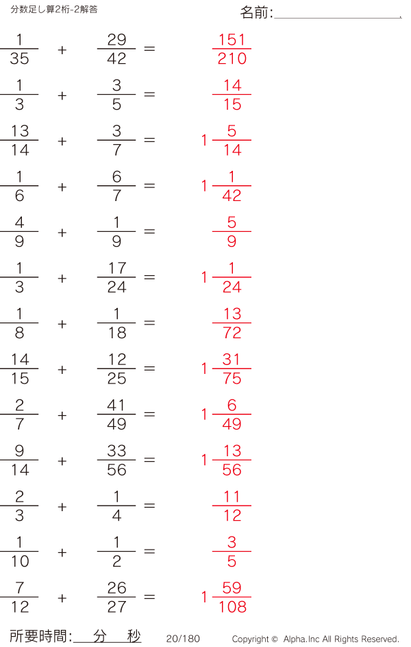上記のボタンから「分数の足し算(分母2桁-2)」の算数数学ドリル・計算ドリル(PDFプリント)がダウンロードできます。個人利用は無料です(家庭以外での配布は有料です)。