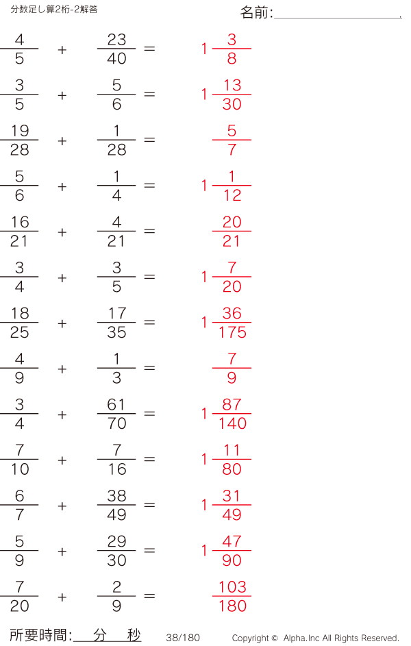 上記のボタンから「分数の足し算(分母2桁-2)」の算数数学ドリル・計算ドリル(PDFプリント)がダウンロードできます。個人利用は無料です(家庭以外での配布は有料です)。