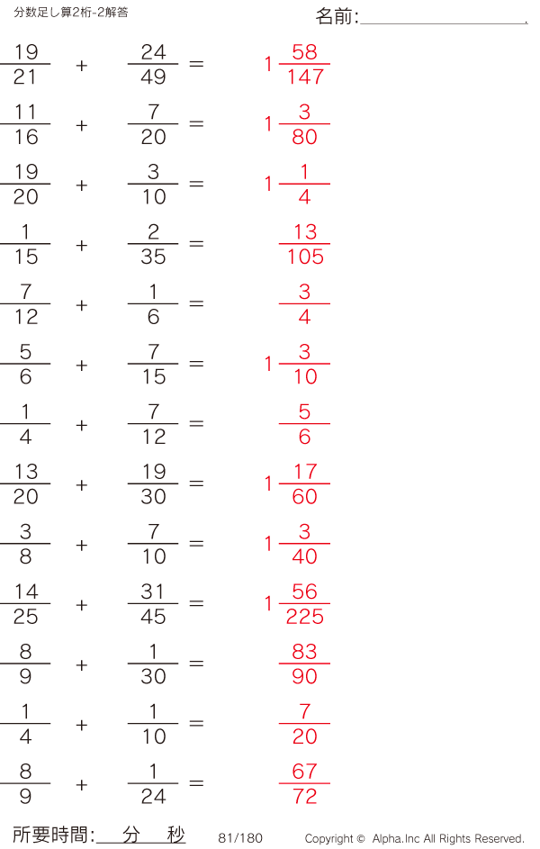 上記のボタンから「分数の足し算(分母2桁-2)」の算数数学ドリル・計算ドリル(PDFプリント)がダウンロードできます。個人利用は無料です(家庭以外での配布は有料です)。