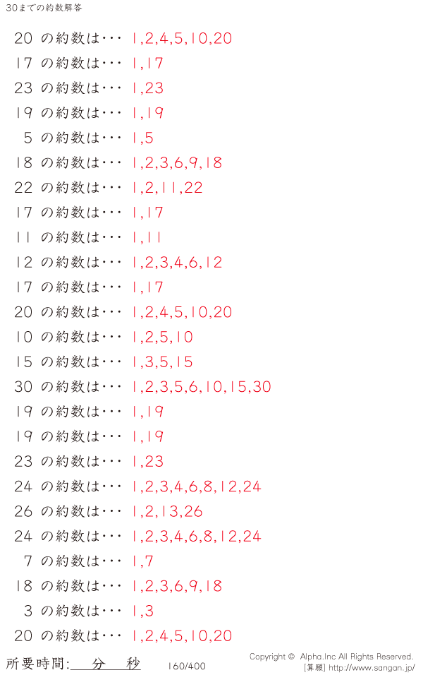 上記のボタンから「30までの約数」の算数数学ドリル・計算ドリル(PDFプリント)がダウンロードできます。個人利用は無料です(家庭以外での配布は有料です)。