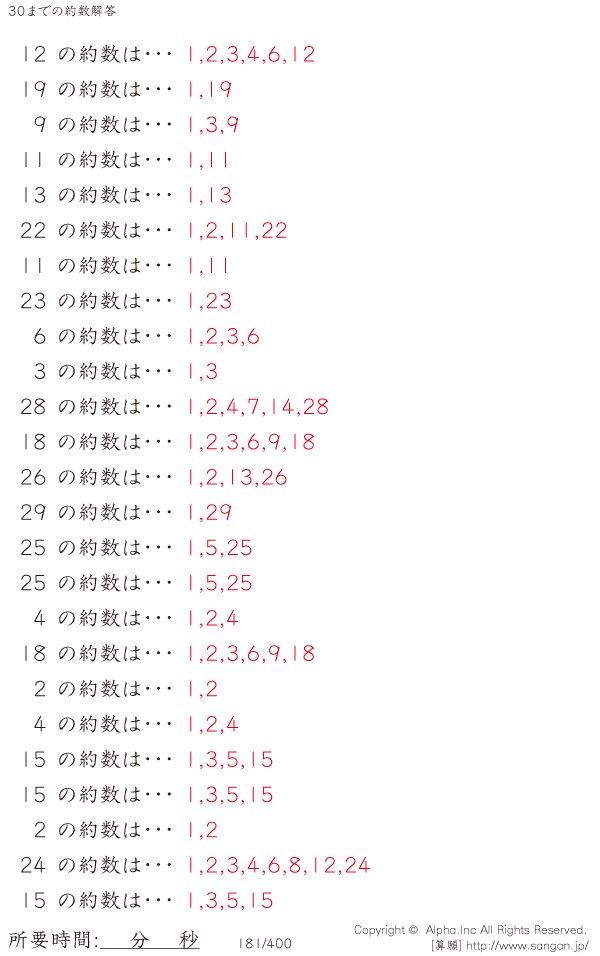 上記のボタンから「30までの約数」の算数数学ドリル・計算ドリル(PDFプリント)がダウンロードできます。個人利用は無料です(家庭以外での配布は有料です)。
