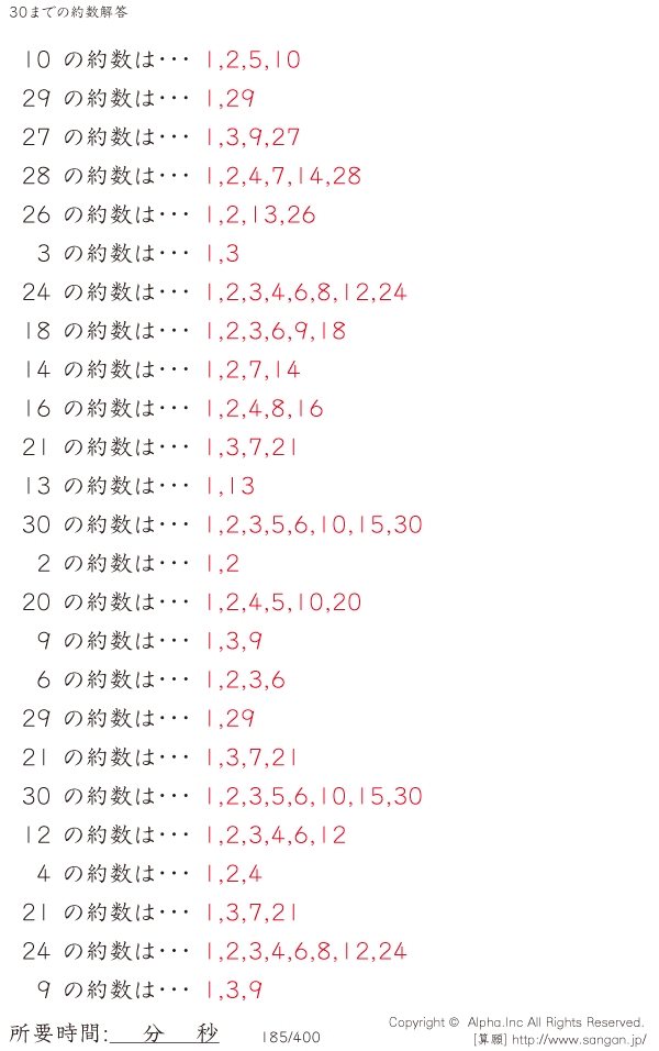 上記のボタンから「30までの約数」の算数数学ドリル・計算ドリル(PDFプリント)がダウンロードできます。個人利用は無料です(家庭以外での配布は有料です)。