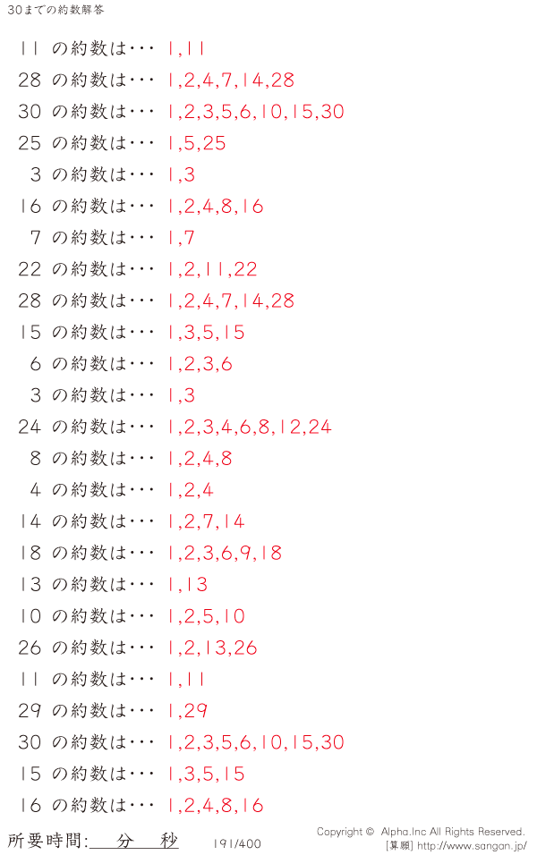上記のボタンから「30までの約数」の算数数学ドリル・計算ドリル(PDFプリント)がダウンロードできます。個人利用は無料です(家庭以外での配布は有料です)。