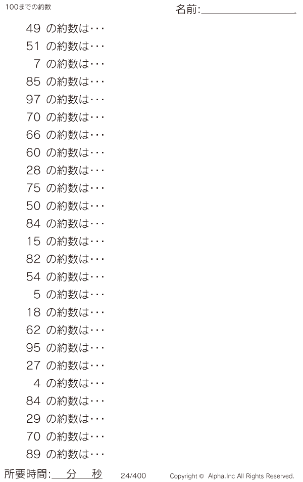 上記のボタンから「100までの約数」の算数数学ドリル・計算ドリル(PDFプリント)がダウンロードできます。個人利用は無料です(家庭以外での配布は有料です)。