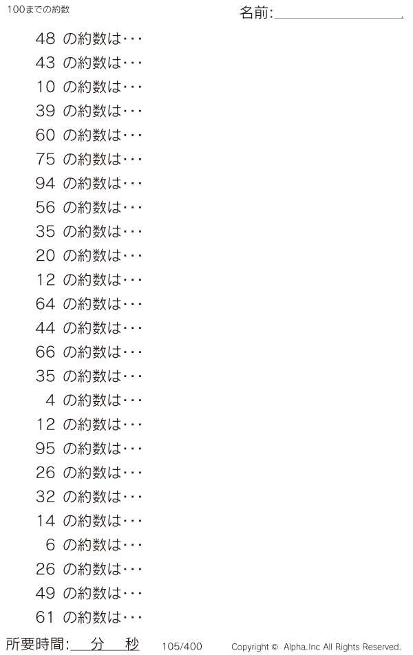 上記のボタンから「100までの約数」の算数数学ドリル・計算ドリル(PDFプリント)がダウンロードできます。個人利用は無料です(家庭以外での配布は有料です)。