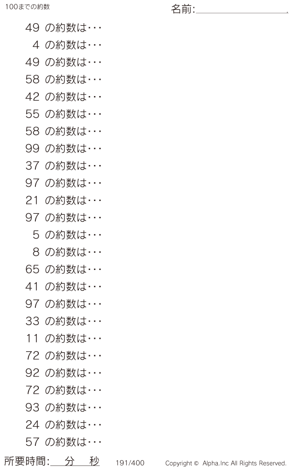 上記のボタンから「100までの約数」の算数数学ドリル・計算ドリル(PDFプリント)がダウンロードできます。個人利用は無料です(家庭以外での配布は有料です)。