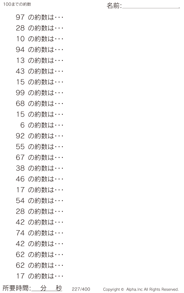 上記のボタンから「100までの約数」の算数数学ドリル・計算ドリル(PDFプリント)がダウンロードできます。個人利用は無料です(家庭以外での配布は有料です)。