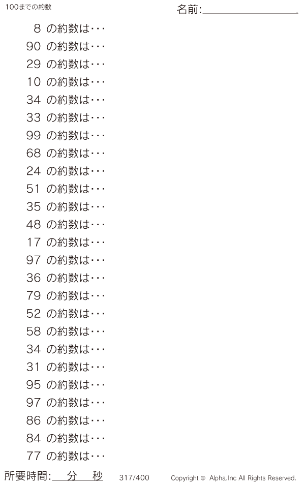 上記のボタンから「100までの約数」の算数数学ドリル・計算ドリル(PDFプリント)がダウンロードできます。個人利用は無料です(家庭以外での配布は有料です)。