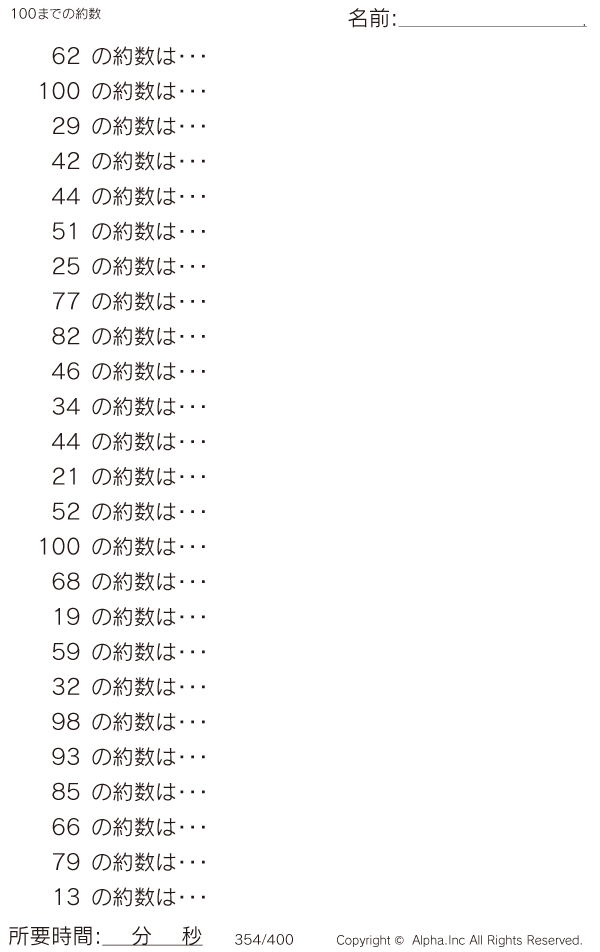 上記のボタンから「100までの約数」の算数数学ドリル・計算ドリル(PDFプリント)がダウンロードできます。個人利用は無料です(家庭以外での配布は有料です)。