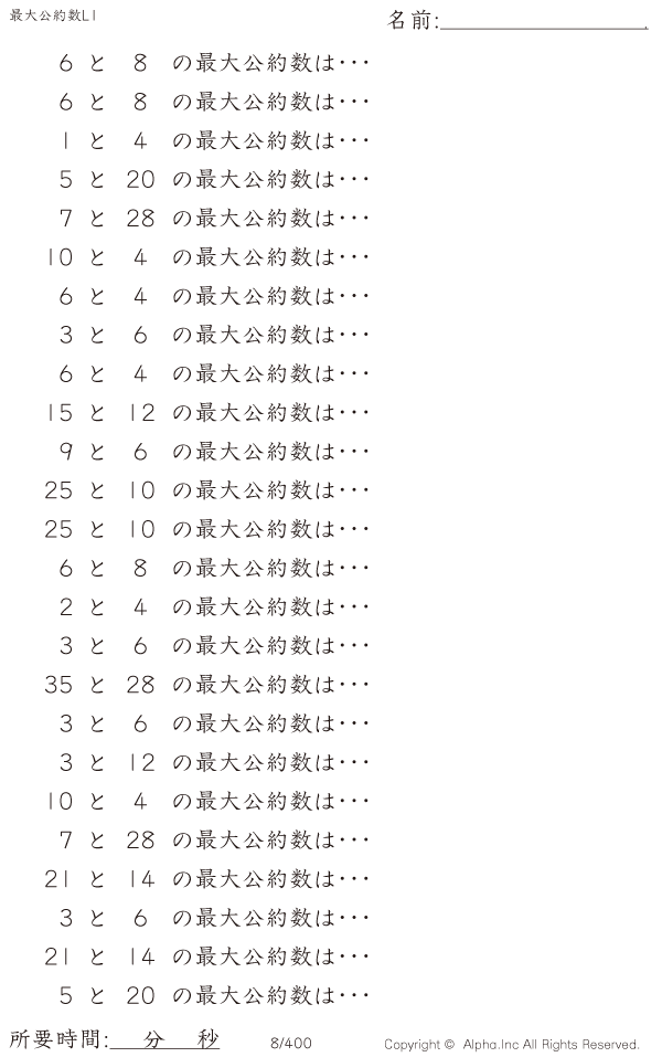 上記のボタンから「最大公約数レベル1」の算数数学ドリル・計算ドリル(PDFプリント)がダウンロードできます。個人利用は無料です(家庭以外での配布は有料です)。