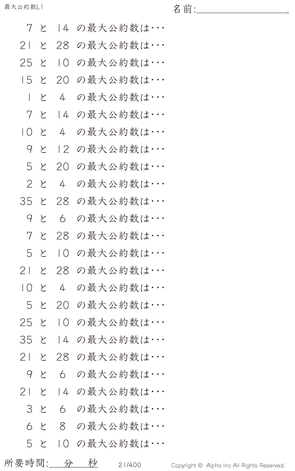 上記のボタンから「最大公約数レベル1」の算数数学ドリル・計算ドリル(PDFプリント)がダウンロードできます。個人利用は無料です(家庭以外での配布は有料です)。
