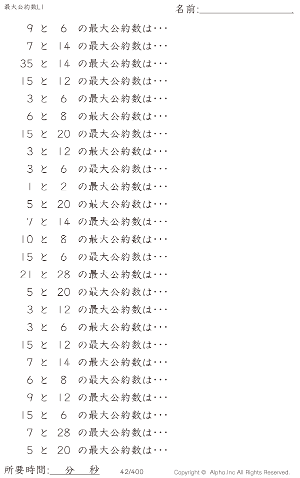 上記のボタンから「最大公約数レベル1」の算数数学ドリル・計算ドリル(PDFプリント)がダウンロードできます。個人利用は無料です(家庭以外での配布は有料です)。