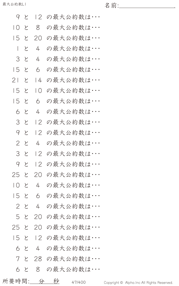 上記のボタンから「最大公約数レベル1」の算数数学ドリル・計算ドリル(PDFプリント)がダウンロードできます。個人利用は無料です(家庭以外での配布は有料です)。