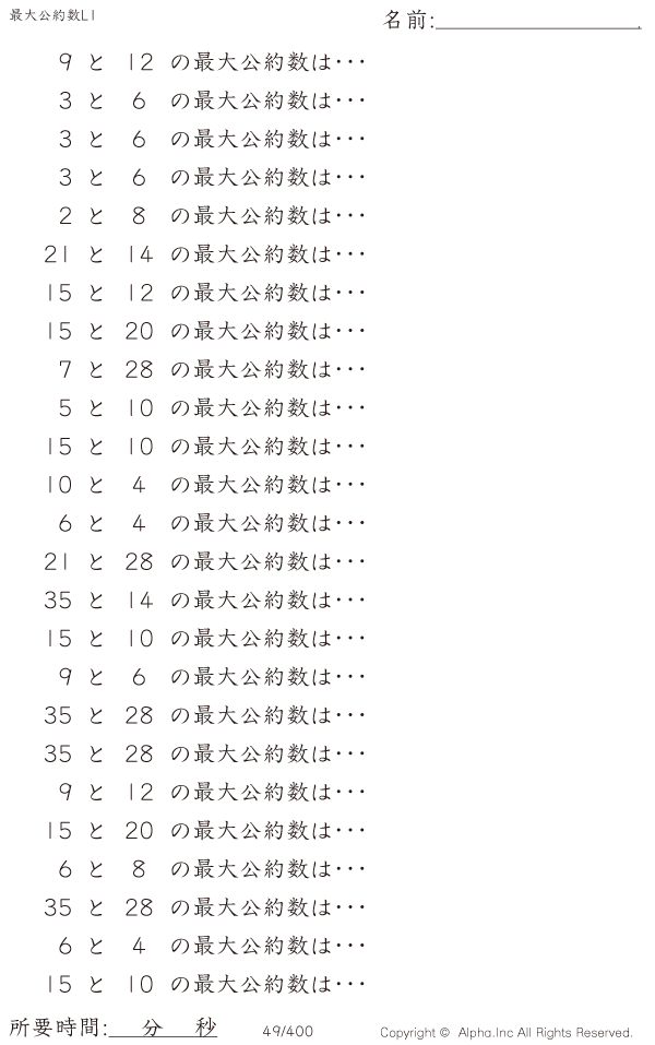 上記のボタンから「最大公約数レベル1」の算数数学ドリル・計算ドリル(PDFプリント)がダウンロードできます。個人利用は無料です(家庭以外での配布は有料です)。