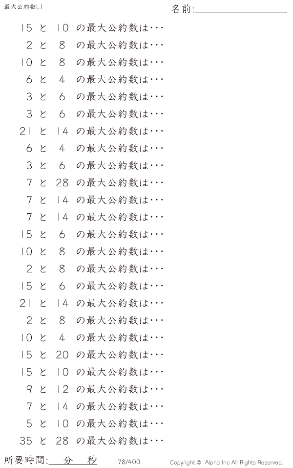 上記のボタンから「最大公約数レベル1」の算数数学ドリル・計算ドリル(PDFプリント)がダウンロードできます。個人利用は無料です(家庭以外での配布は有料です)。