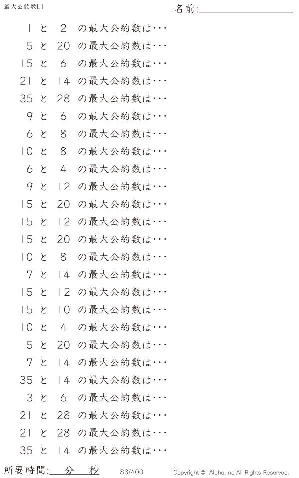 上記のボタンから「最大公約数レベル1」の算数数学ドリル・計算ドリル(PDFプリント)がダウンロードできます。個人利用は無料です(家庭以外での配布は有料です)。