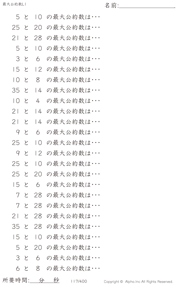 上記のボタンから「最大公約数レベル1」の算数数学ドリル・計算ドリル(PDFプリント)がダウンロードできます。個人利用は無料です(家庭以外での配布は有料です)。
