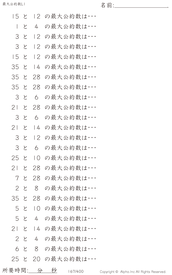 上記のボタンから「最大公約数レベル1」の算数数学ドリル・計算ドリル(PDFプリント)がダウンロードできます。個人利用は無料です(家庭以外での配布は有料です)。