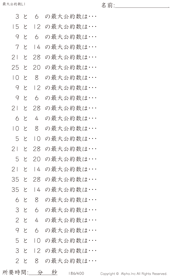 上記のボタンから「最大公約数レベル1」の算数数学ドリル・計算ドリル(PDFプリント)がダウンロードできます。個人利用は無料です(家庭以外での配布は有料です)。