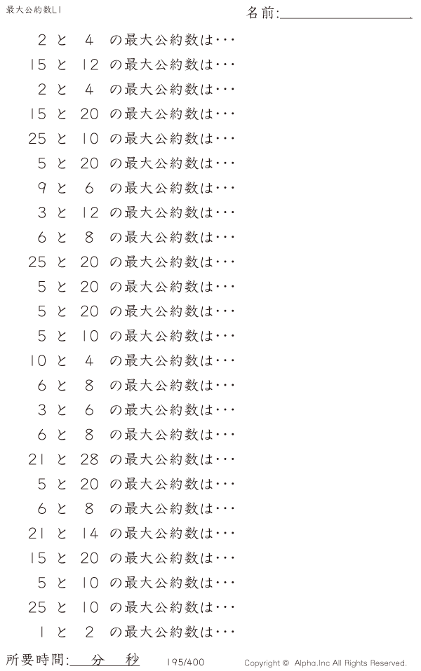 上記のボタンから「最大公約数レベル1」の算数数学ドリル・計算ドリル(PDFプリント)がダウンロードできます。個人利用は無料です(家庭以外での配布は有料です)。