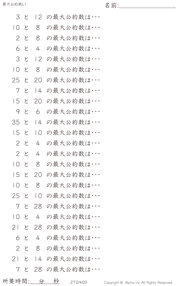 上記のボタンから「最大公約数レベル1」の算数数学ドリル・計算ドリル(PDFプリント)がダウンロードできます。個人利用は無料です(家庭以外での配布は有料です)。