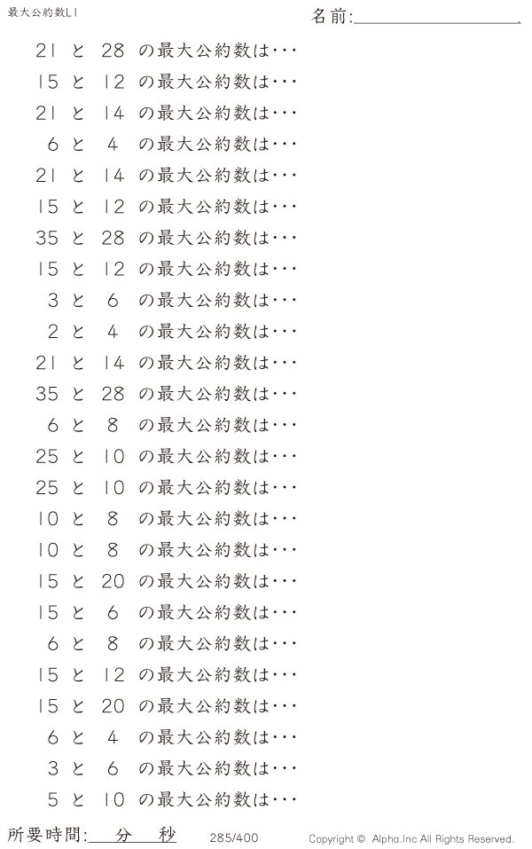 上記のボタンから「最大公約数レベル1」の算数数学ドリル・計算ドリル(PDFプリント)がダウンロードできます。個人利用は無料です(家庭以外での配布は有料です)。