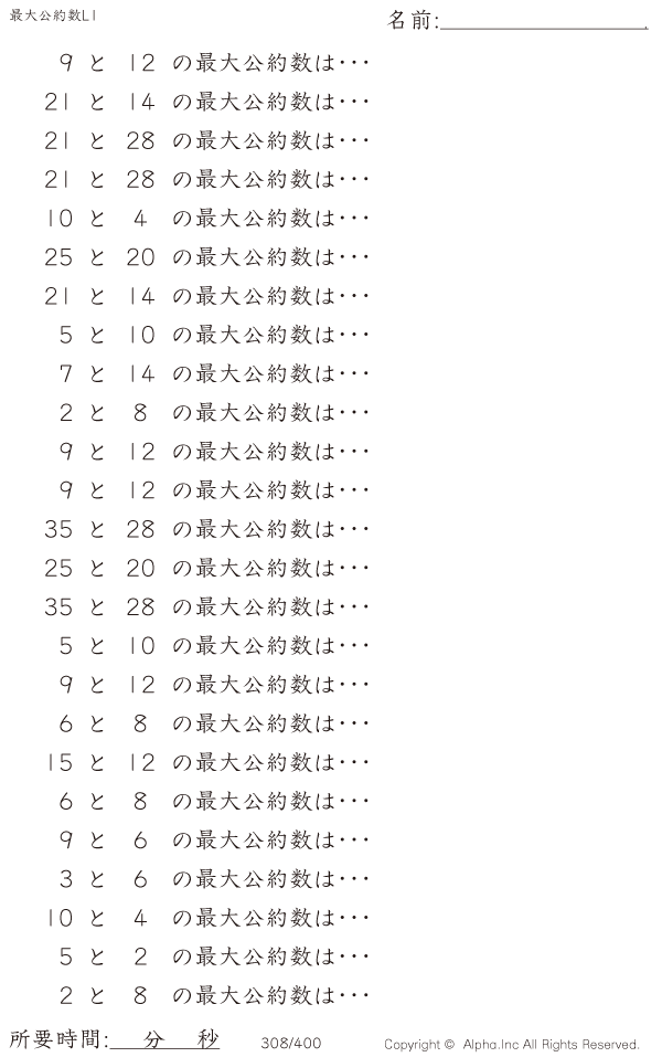 上記のボタンから「最大公約数レベル1」の算数数学ドリル・計算ドリル(PDFプリント)がダウンロードできます。個人利用は無料です(家庭以外での配布は有料です)。
