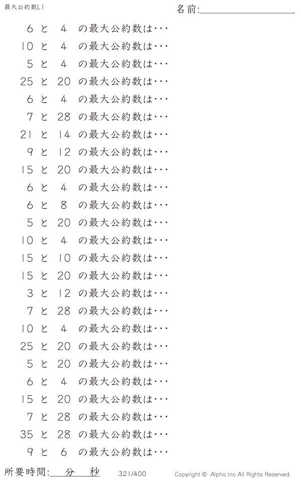 上記のボタンから「最大公約数レベル1」の算数数学ドリル・計算ドリル(PDFプリント)がダウンロードできます。個人利用は無料です(家庭以外での配布は有料です)。