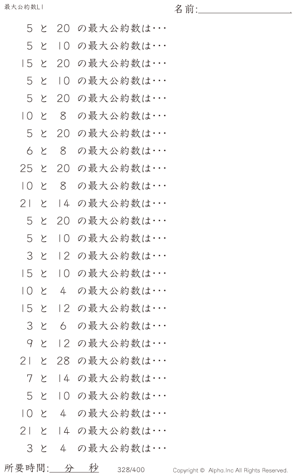 上記のボタンから「最大公約数レベル1」の算数数学ドリル・計算ドリル(PDFプリント)がダウンロードできます。個人利用は無料です(家庭以外での配布は有料です)。
