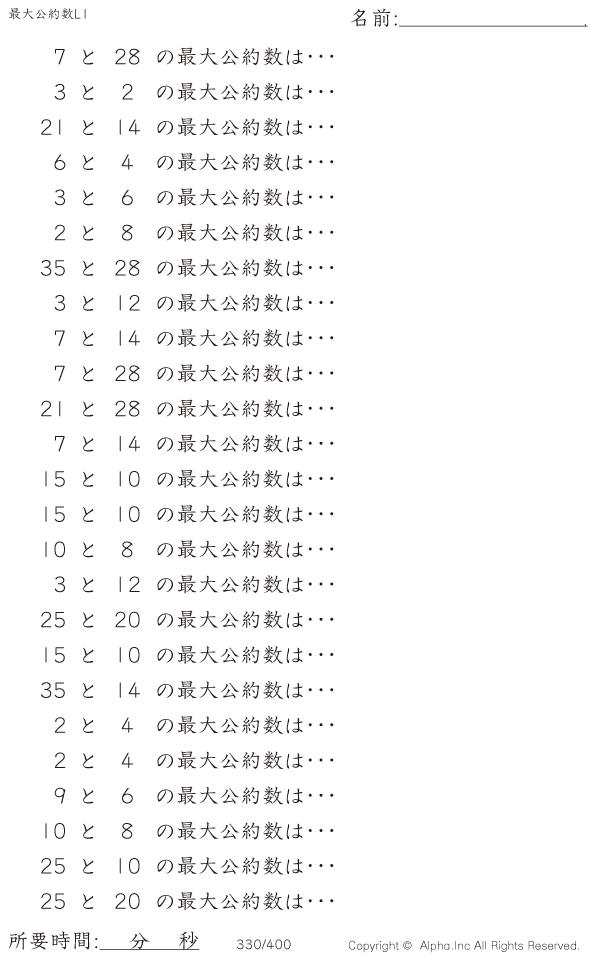 上記のボタンから「最大公約数レベル1」の算数数学ドリル・計算ドリル(PDFプリント)がダウンロードできます。個人利用は無料です(家庭以外での配布は有料です)。