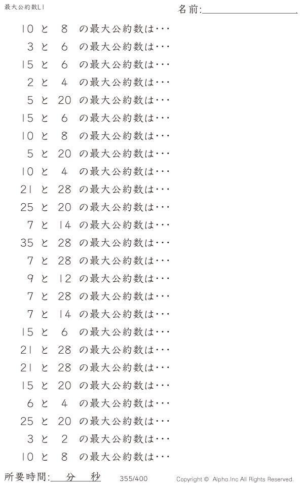 上記のボタンから「最大公約数レベル1」の算数数学ドリル・計算ドリル(PDFプリント)がダウンロードできます。個人利用は無料です(家庭以外での配布は有料です)。