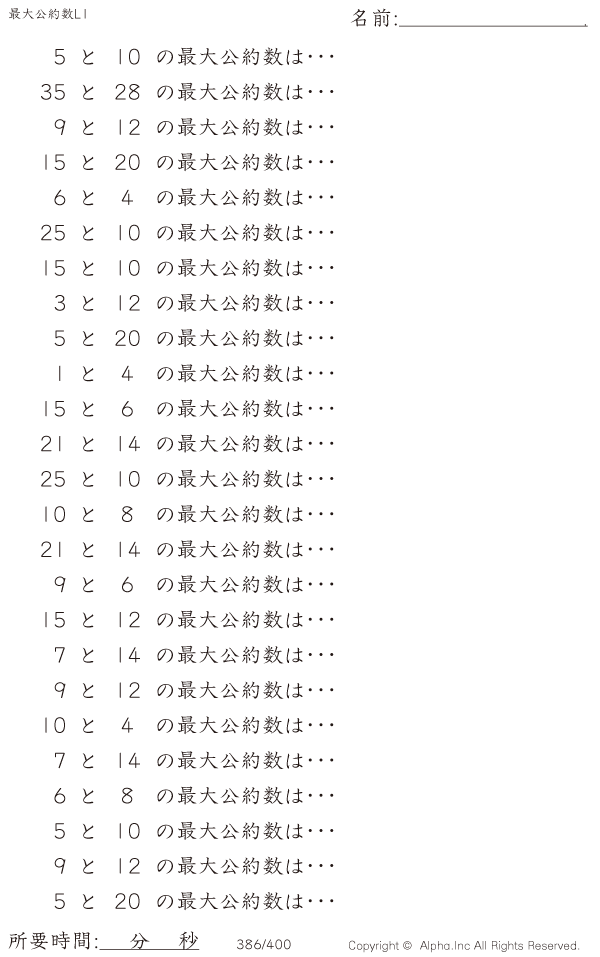 上記のボタンから「最大公約数レベル1」の算数数学ドリル・計算ドリル(PDFプリント)がダウンロードできます。個人利用は無料です(家庭以外での配布は有料です)。