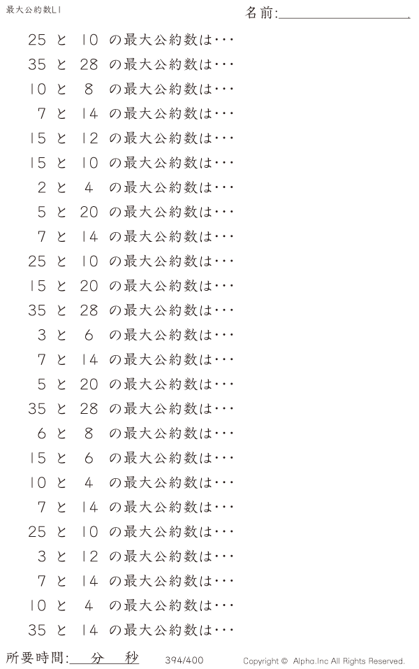 上記のボタンから「最大公約数レベル1」の算数数学ドリル・計算ドリル(PDFプリント)がダウンロードできます。個人利用は無料です(家庭以外での配布は有料です)。