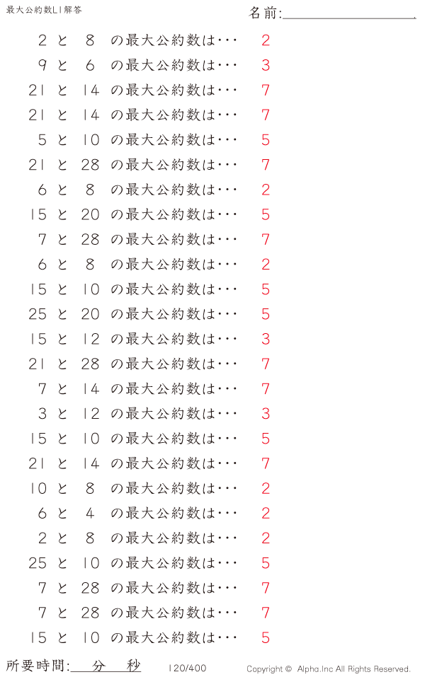 上記のボタンから「最大公約数レベル1」の算数数学ドリル・計算ドリル(PDFプリント)がダウンロードできます。個人利用は無料です(家庭以外での配布は有料です)。