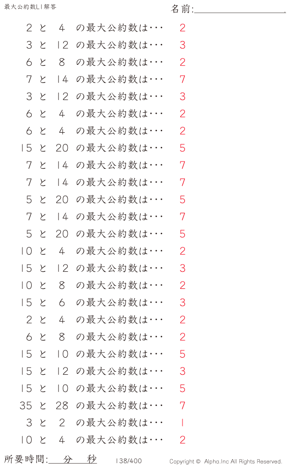 上記のボタンから「最大公約数レベル1」の算数数学ドリル・計算ドリル(PDFプリント)がダウンロードできます。個人利用は無料です(家庭以外での配布は有料です)。