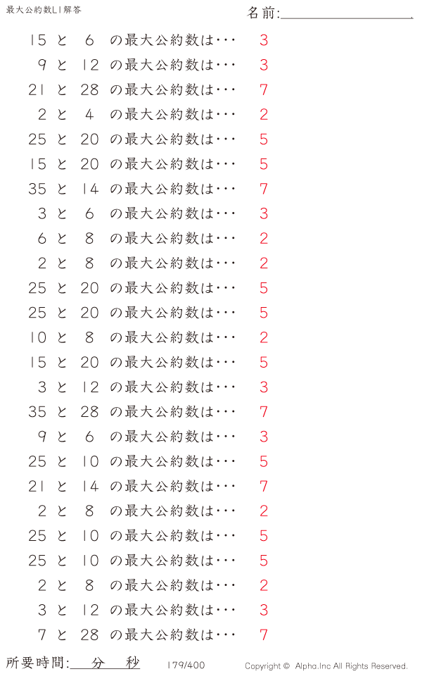 上記のボタンから「最大公約数レベル1」の算数数学ドリル・計算ドリル(PDFプリント)がダウンロードできます。個人利用は無料です(家庭以外での配布は有料です)。