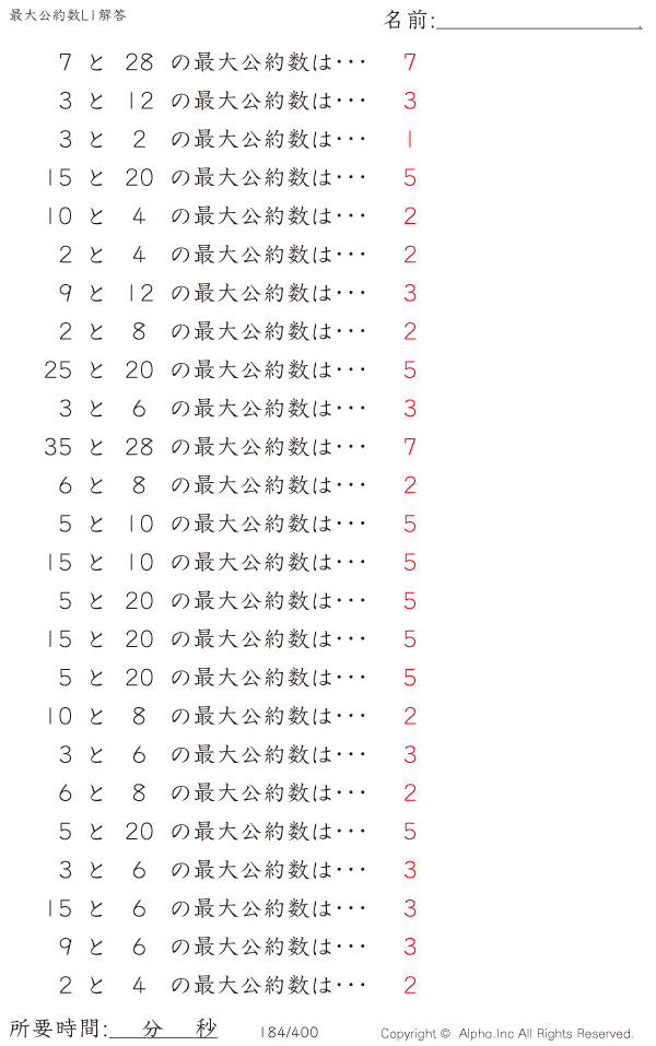 上記のボタンから「最大公約数レベル1」の算数数学ドリル・計算ドリル(PDFプリント)がダウンロードできます。個人利用は無料です(家庭以外での配布は有料です)。