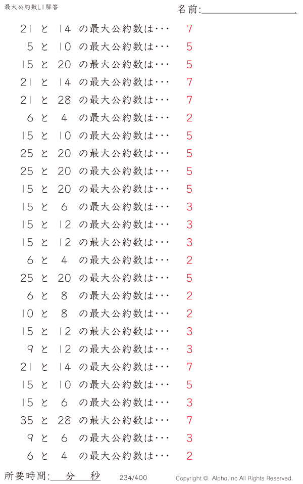 上記のボタンから「最大公約数レベル1」の算数数学ドリル・計算ドリル(PDFプリント)がダウンロードできます。個人利用は無料です(家庭以外での配布は有料です)。