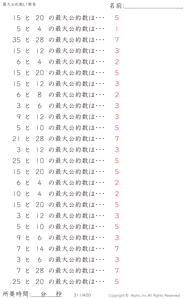 上記のボタンから「最大公約数レベル1」の算数数学ドリル・計算ドリル(PDFプリント)がダウンロードできます。個人利用は無料です(家庭以外での配布は有料です)。