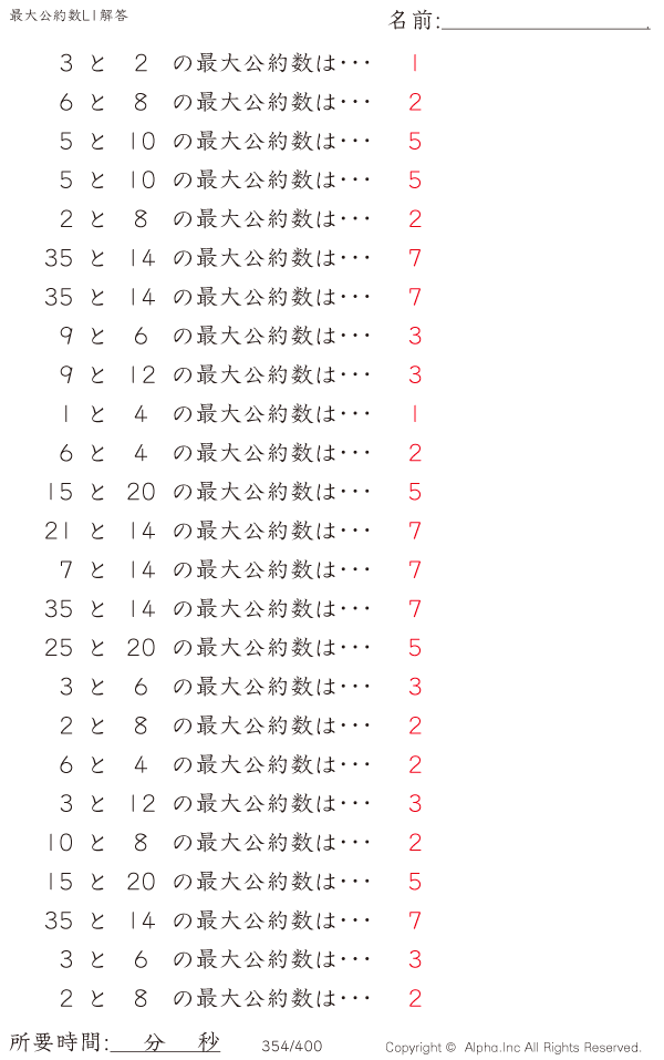 上記のボタンから「最大公約数レベル1」の算数数学ドリル・計算ドリル(PDFプリント)がダウンロードできます。個人利用は無料です(家庭以外での配布は有料です)。