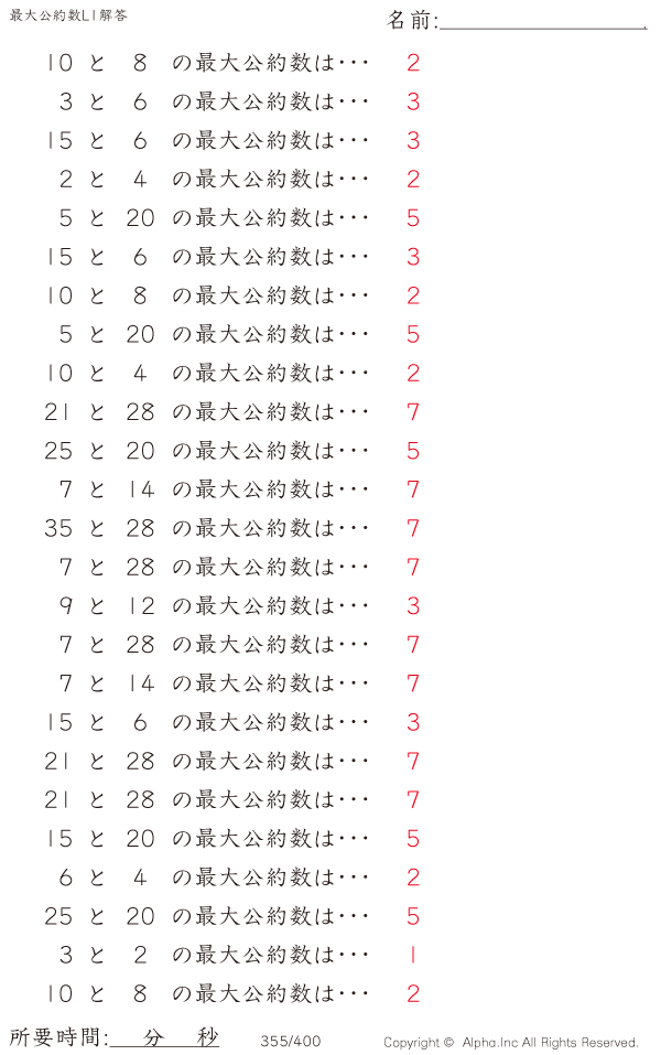上記のボタンから「最大公約数レベル1」の算数数学ドリル・計算ドリル(PDFプリント)がダウンロードできます。個人利用は無料です(家庭以外での配布は有料です)。