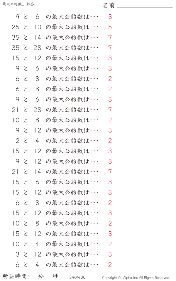 上記のボタンから「最大公約数レベル1」の算数数学ドリル・計算ドリル(PDFプリント)がダウンロードできます。個人利用は無料です(家庭以外での配布は有料です)。