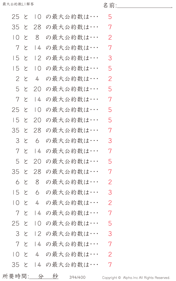 上記のボタンから「最大公約数レベル1」の算数数学ドリル・計算ドリル(PDFプリント)がダウンロードできます。個人利用は無料です(家庭以外での配布は有料です)。