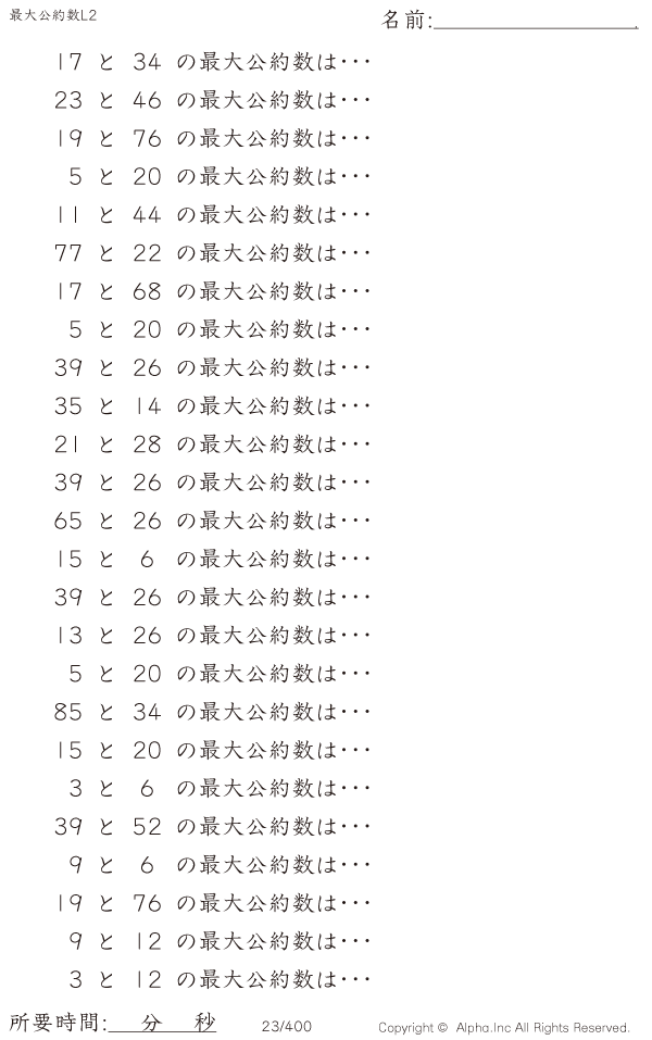 上記のボタンから「最大公約数レベル2」の算数数学ドリル・計算ドリル(PDFプリント)がダウンロードできます。個人利用は無料です(家庭以外での配布は有料です)。