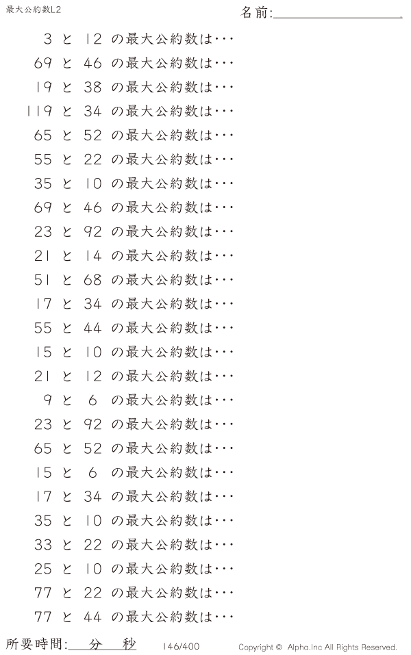 上記のボタンから「最大公約数レベル2」の算数数学ドリル・計算ドリル(PDFプリント)がダウンロードできます。個人利用は無料です(家庭以外での配布は有料です)。