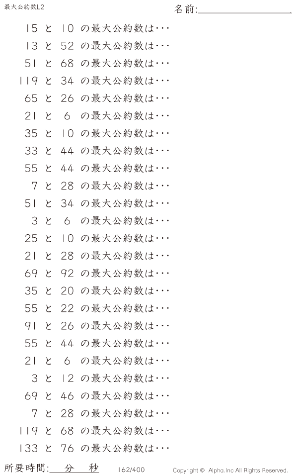 上記のボタンから「最大公約数レベル2」の算数数学ドリル・計算ドリル(PDFプリント)がダウンロードできます。個人利用は無料です(家庭以外での配布は有料です)。
