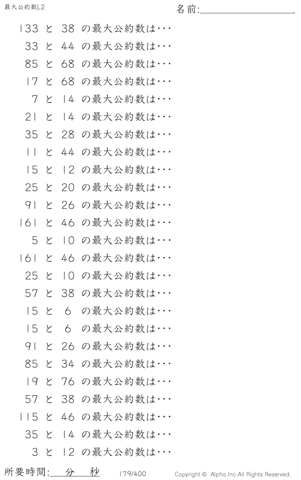 上記のボタンから「最大公約数レベル2」の算数数学ドリル・計算ドリル(PDFプリント)がダウンロードできます。個人利用は無料です(家庭以外での配布は有料です)。