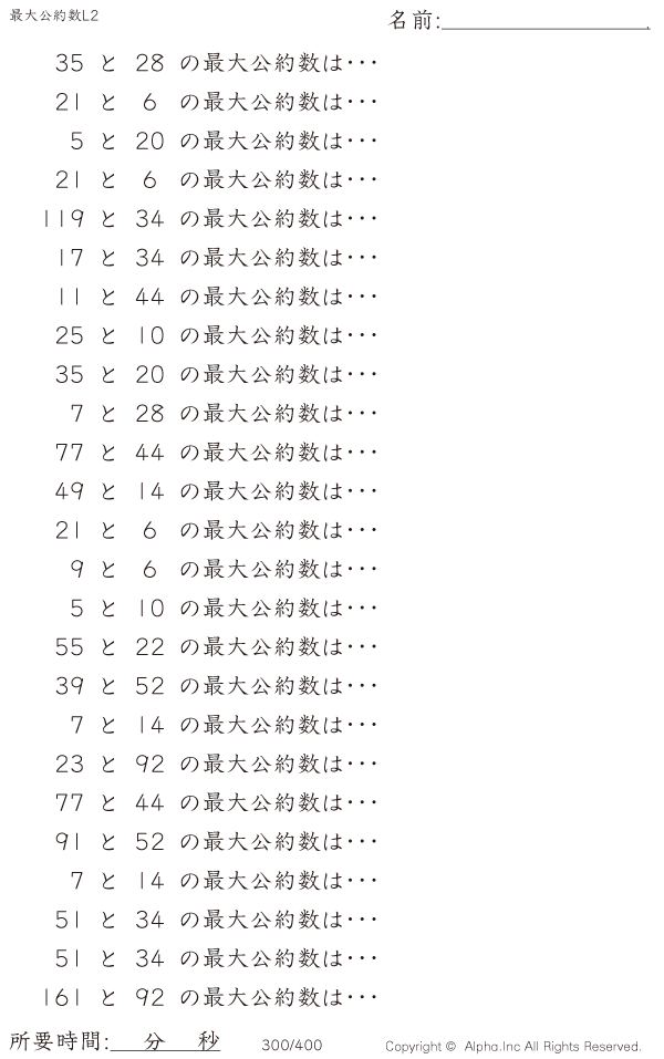 上記のボタンから「最大公約数レベル2」の算数数学ドリル・計算ドリル(PDFプリント)がダウンロードできます。個人利用は無料です(家庭以外での配布は有料です)。