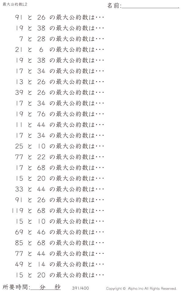 上記のボタンから「最大公約数レベル2」の算数数学ドリル・計算ドリル(PDFプリント)がダウンロードできます。個人利用は無料です(家庭以外での配布は有料です)。